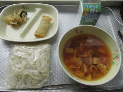 今日のメニューは、五目うどん、ひじきの春巻き、もやしの和え物でした。
