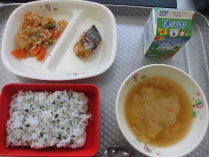 秘技3台連結運びで配膳された今日のメニューは、わかめご飯、厚揚げの味噌汁、鯖の塩焼き、大根のそぼろ煮でした。