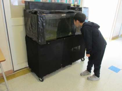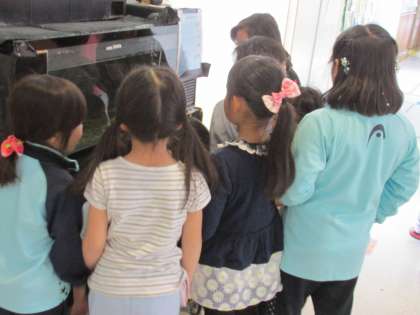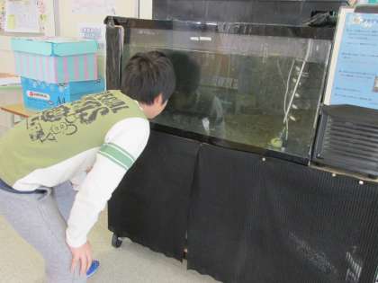 旭っ子ルーム前に水槽を移したとたん、休み時間には、観察する子が続々。
