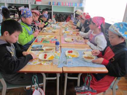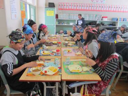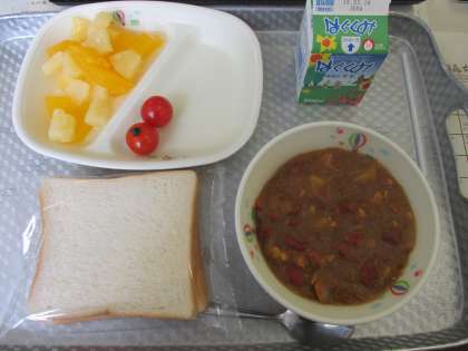 今日のメニューは、スライスパン、キーマカレー、ミニトマト、フルーツゼリー和えでした。食事の様子は、5年生です。