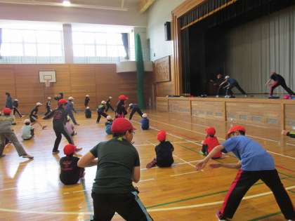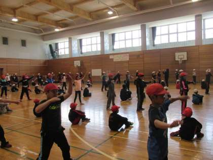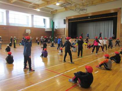 5・6年生の合同体育の様子です。6年生が5年生に高学年ソーランを教えています。