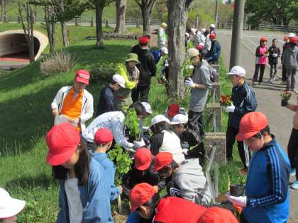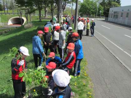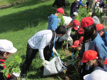 朝のうちに教育実習生さんが穴を掘ってくれたところに、6年生が土と肥料を入れ、アジサイの苗を植えました。