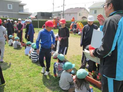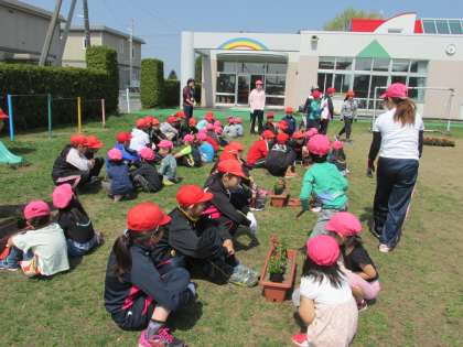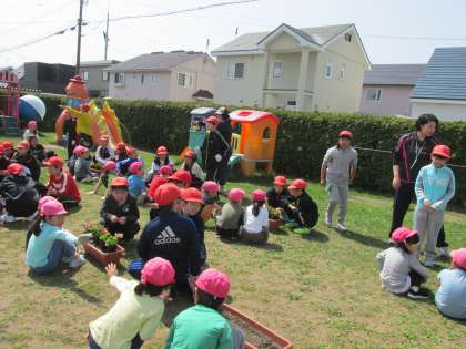 恵み野第二幼稚園の園児さんと5年生、仲良くベゴニアを植えました。