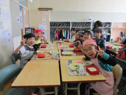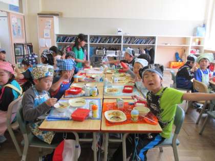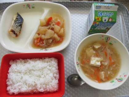今日のメニューは、ご飯、厚揚げの味噌汁、鯖の塩焼き、肉じゃがでした。食事の様子は、2年3組です。