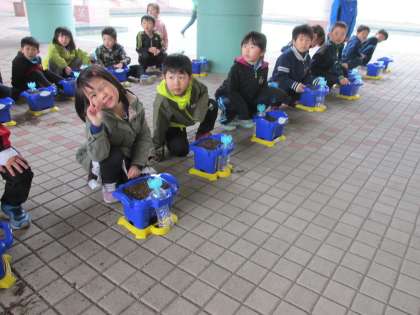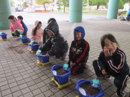 雨が降っていたのでピロティーで種植えをして、水やりは雨にしてもらいました。