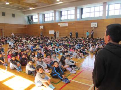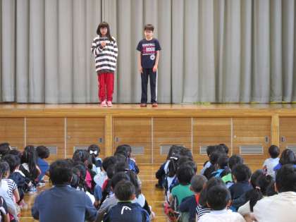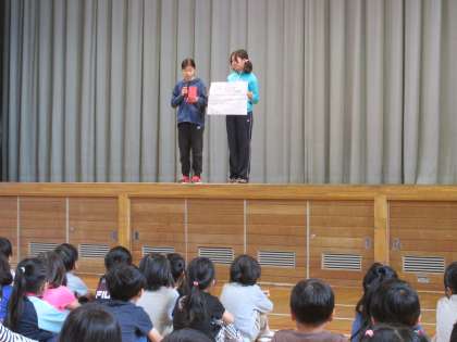 今朝の児童朝会の様子です。委員会や運動会係からの連絡や学校長の話を聞きました。1年生は、初めての児童朝会参加でしたがとてもとても立派でした。