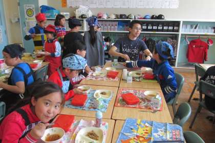 4年2組38人学級の給食の様子です。