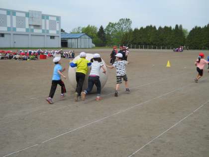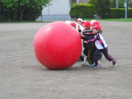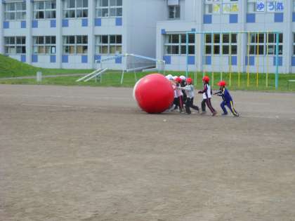 1・2年体育《大玉コロコロ》の練習の様子です。今日はグラウンドで行いました。