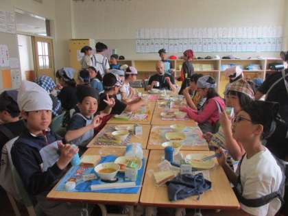 6年生の外国語活動の様子です。シーザー先生と一緒に給食も食べました。