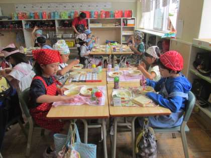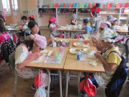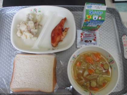今日のメニューは、スライスパン、カレー風味スープ、チキンチャップ、ジャーマンポテト、いちごジャムでした。