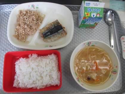 今日のメニューは、ご飯、大根と油揚げの味噌汁、さんまの塩焼き、肉そぼろでした。