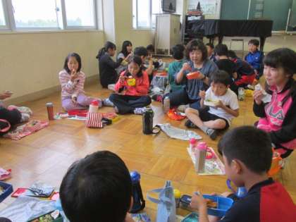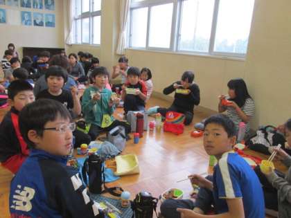 音楽室での3・5年生の食事の様子です。