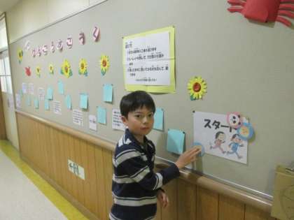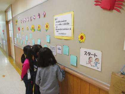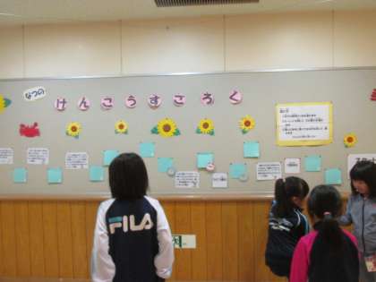保健室前の掲示板が夏バージョンにリニューアルし、子ども達が健康すごろくを楽しんでいます。