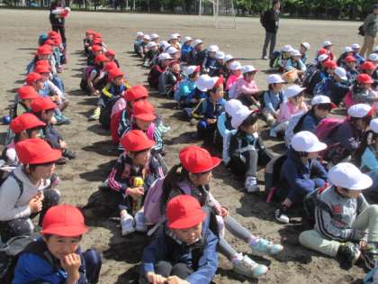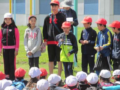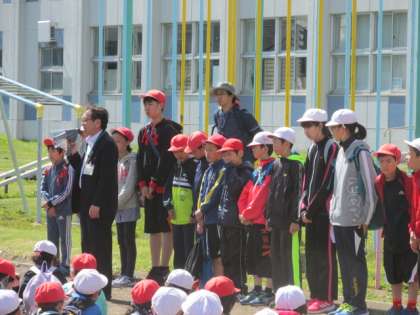 学校長の話を聞き、体育委員がめあてや約束の発表をしました。