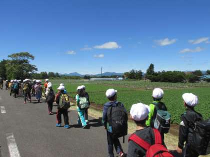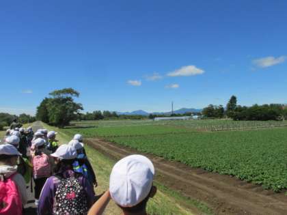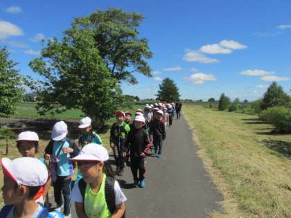 2年生は遠回りをして、中恵庭《漁川橋》の手前を曲がり、漁川河川敷のすてきな道を通って中島公園を目指しました。遠くに、樽前山、風不死岳、紋別岳、恵庭岳、空沼岳を見ながら、青空と田園風景の美しさに見とれながら歩いていきました。