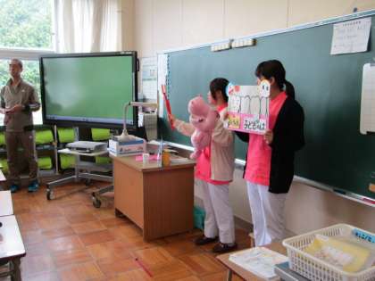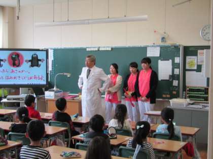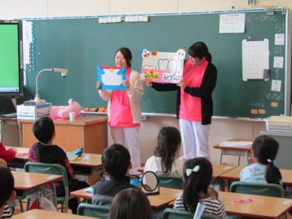1時間目に学校歯科医のめぐみの歯科,すぎえ歯科の先生や歯科衛生士さんをお招きし、1年生に歯磨き指導をしていただきました。