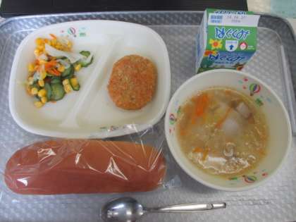今日のメニューは、コッペパン、水餃子スープ、かぼちゃコロッケ、キャベツとコーンのサラダでした。