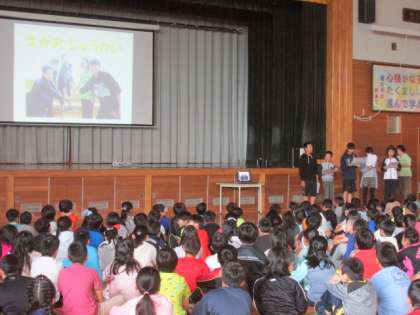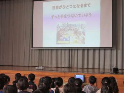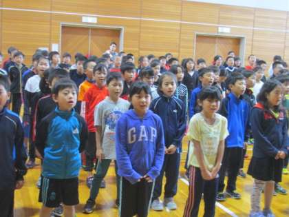 笑顔宣言が全校児童に賛成された後、全校で想いをこめて『世界がひとつになるまで』を合唱しました。