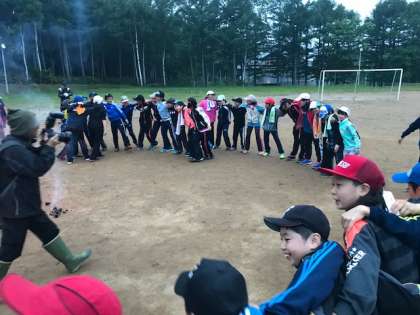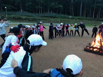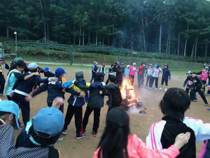 宿泊学習1日目。夕べの集いの様子です。キャンプだほいを楽しんでいます。