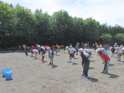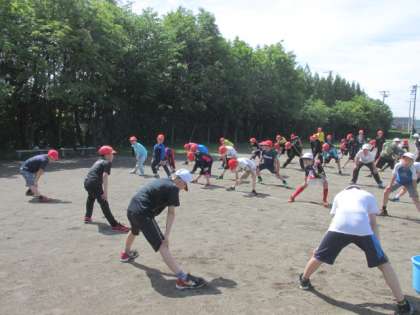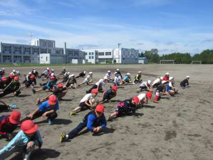 5年生の体育の準備運動の様子です。この後、ソフトボール投げをしました。