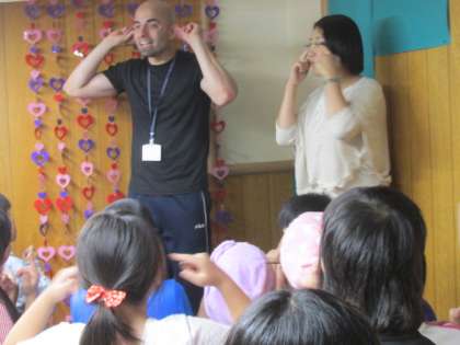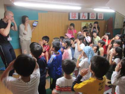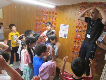 昼休みに、ほんの森で、シーザー先生と学校司書さんが読み聞かせをしてくれました。まずは、英語の歌でウォームアップ。