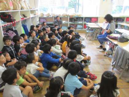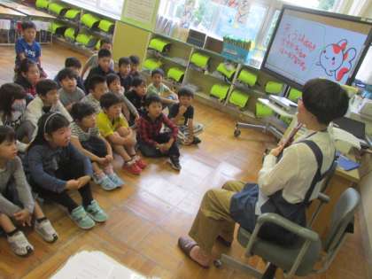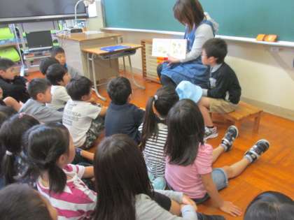 金曜朝恒例の図書ボランティア《おはなしプーさん》による読み聞かせがありました。1・2年生教室での読み聞かせの様子です。
