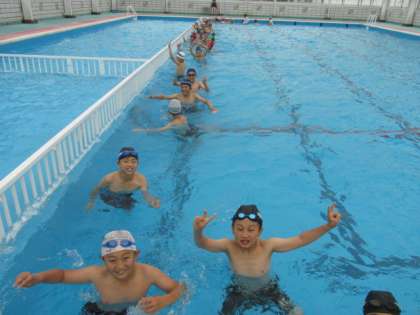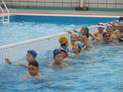 5年生の初水泳学習の様子です。水温25度、室温26度のちょっと寒さを感じる環境でしたが元気にぐるぐると流れるプールを楽しむ5年生です。