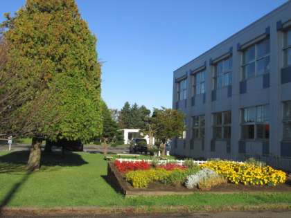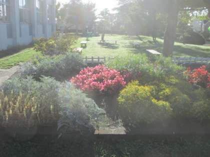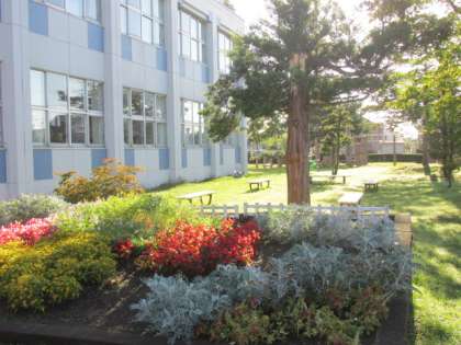 朝日と朝露で輝く前庭の芝生と花壇。台風で折れてしまった松。まだまだ花盛りの花壇。前期登校103日目の児童を待っています。(前期登校予定106日、地震・停電による臨時休校3日間)