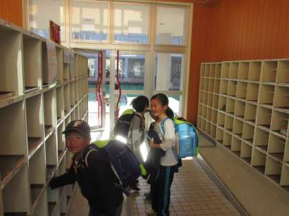前期最終日の登校時、児童玄関・アトリウムの様子です。