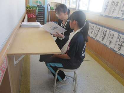 前期の学習の様子を示した《通知表 旭の子》を一人一人に手渡しする4学年。