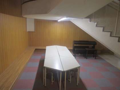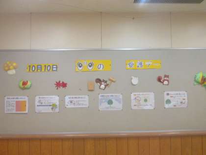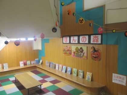 画像は、ハロウィンバージョンのほんの森、マットを敷いた西階段下スペース、リニューアルした保健室前掲示板です。