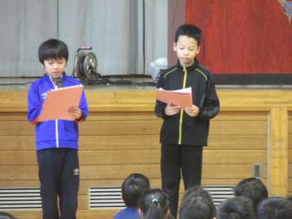 今朝の児童朝会の様子です。各委員会や書記局から11月・12月の取り組みの発表がありました。