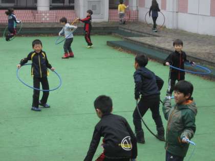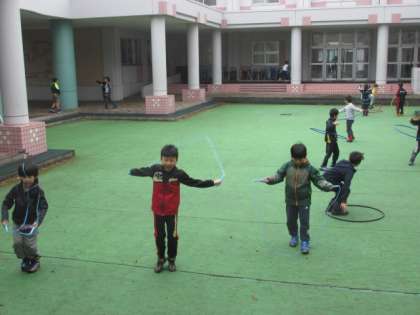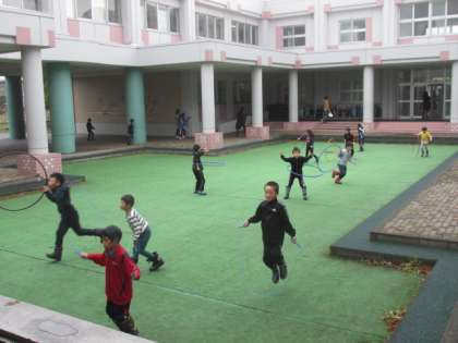 12月なのに上着なしで外遊びができるほど暖かな今日。昼休みにたくさんの子が外で縄跳びやフラフープをしていました。