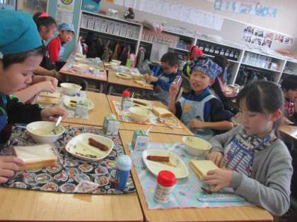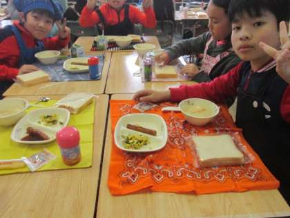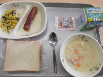 今日のメニューは、スライスパン、チキンクリームシチュー、ウインナーケチャップ、ほうれん草とコーンのソテー、りんごジャムでした。