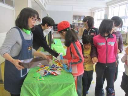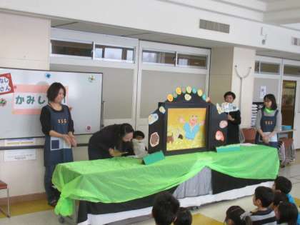 読書月間最終日を飾るすてきな紙芝居でした。終わりには、折り紙プーさんや折り紙コマのプレゼントもありました。おはなしプーさんの皆さん、ありがとうございました。