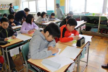 5年生が総合的な学習の時間の福祉学習の一環で《恵庭市点訳赤十字奉仕団》の方々を講師に迎えて、点字の学習を行いました。