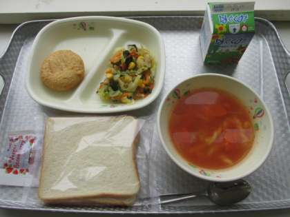 今日のメニューは、スライスパン、ミネストローネスープ、さつまパイ、海草サラダ、いちごジャムでした。