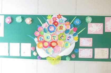 3枚目…同じく体育館前の掲示板。幼稚園や以前お世話になった先生方からの祝文が掲示されています。