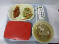 今日の給食は、ご飯、厚揚げの味噌汁、チキン味噌カツ、大豆の五目煮です。