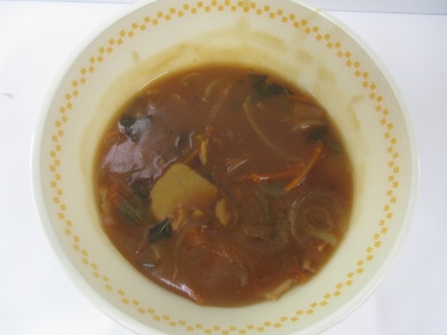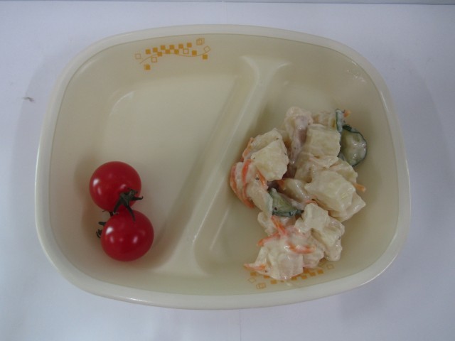 今日の給食は、カレーうどん、ポテトハムサラダ、ミニトマトです。