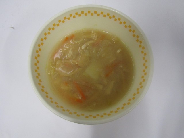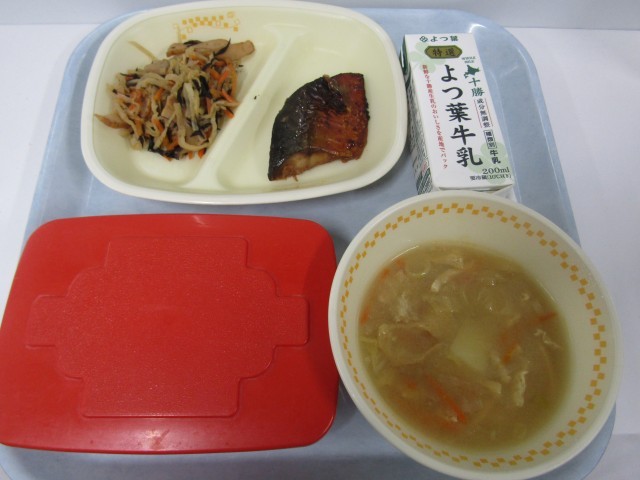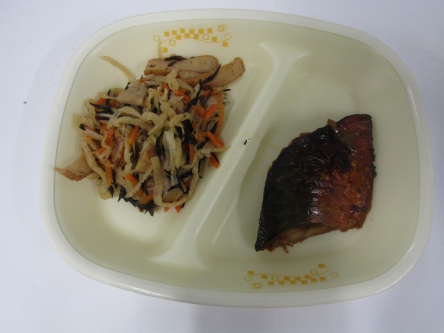 今日の給食は、ご飯、野菜の味噌汁、さばの照り焼き、切干大根の炒め煮です。