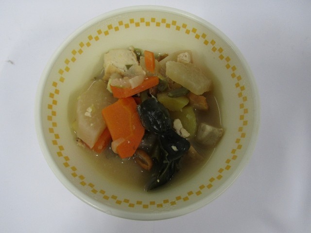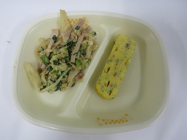 今日の給食は、ご飯、味噌おでん、五目厚焼き卵、小松菜とキャベツのごま和えです
