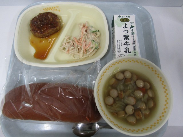 今日の給食は黒糖パン、コンソメスープ、ハンバーグの和風オニオンソース、ごぼうツナサラダです。
