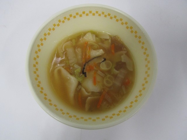 ワンタンは中国、広東省での点心のひとつです。薄い皮で具を包んだ食べ物です。今日は、ワンタンの皮から具が出てしまうので、ワンタンの皮を浮かべたスープにしています。