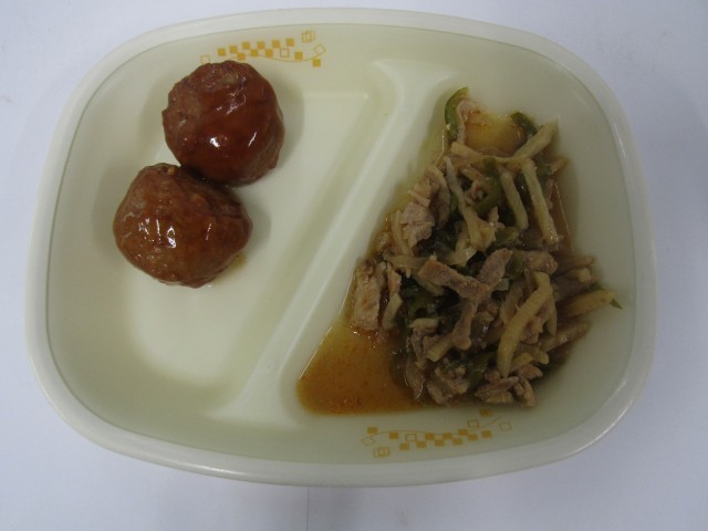 今日の給食は、ご飯、ワンタンスープ、甘酢肉団子、チンジャオロースです。
