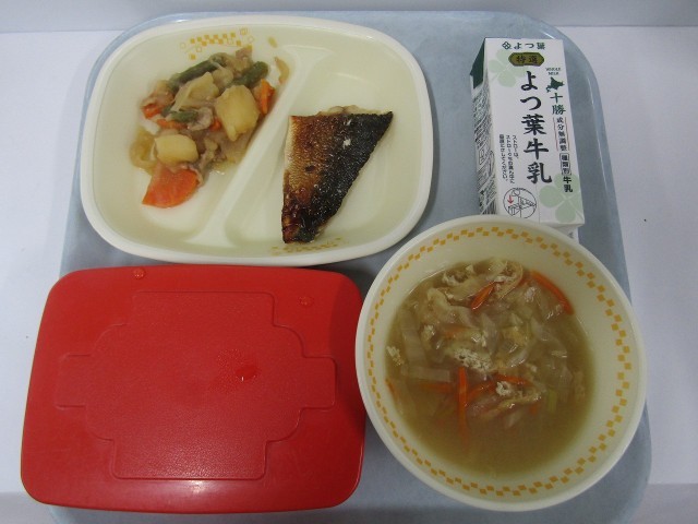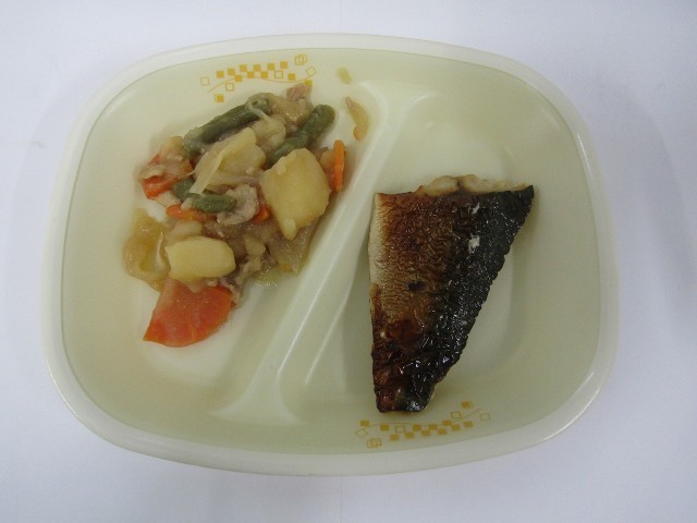 今日の給食は、ご飯、キャベツと油揚げの味噌汁、さばの塩焼き、肉じゃがです。