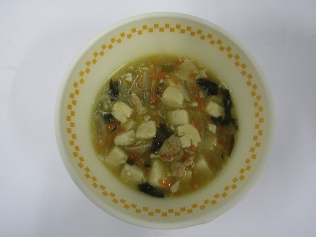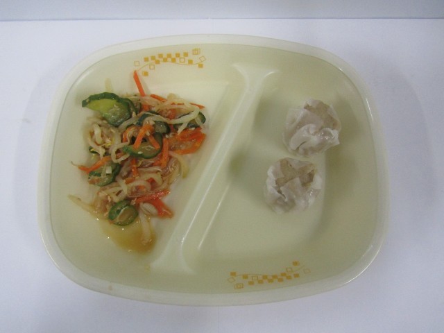 今日の給食は、ご飯、豆腐の中華煮、肉しゅうまい、もやしとささみのナムルです。