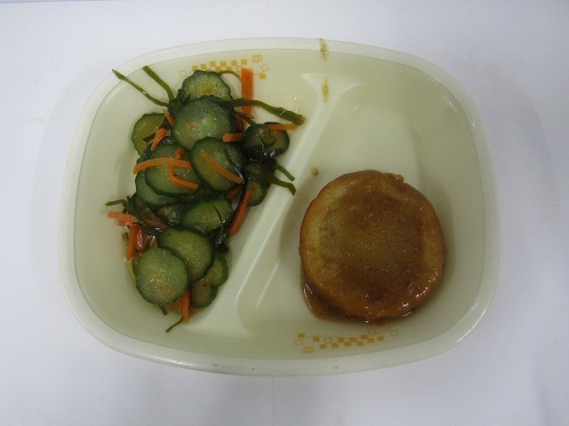 今日の給食は、ちゃんこうどん、ごまだれいももち、きゅうりのピリ辛昆布和えです。