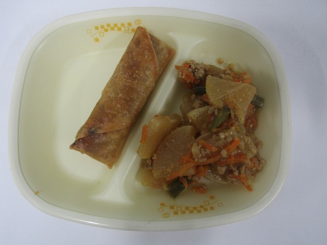 今日の給食は、ご飯、春雨スープ、春巻き、大根のピリ辛そぼろです。