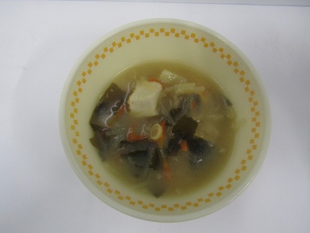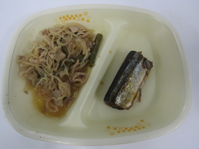 今日の給食は、ご飯、厚揚げとわかめの味噌汁、さんまの生姜煮、豚肉と白滝のしぐれ煮です。